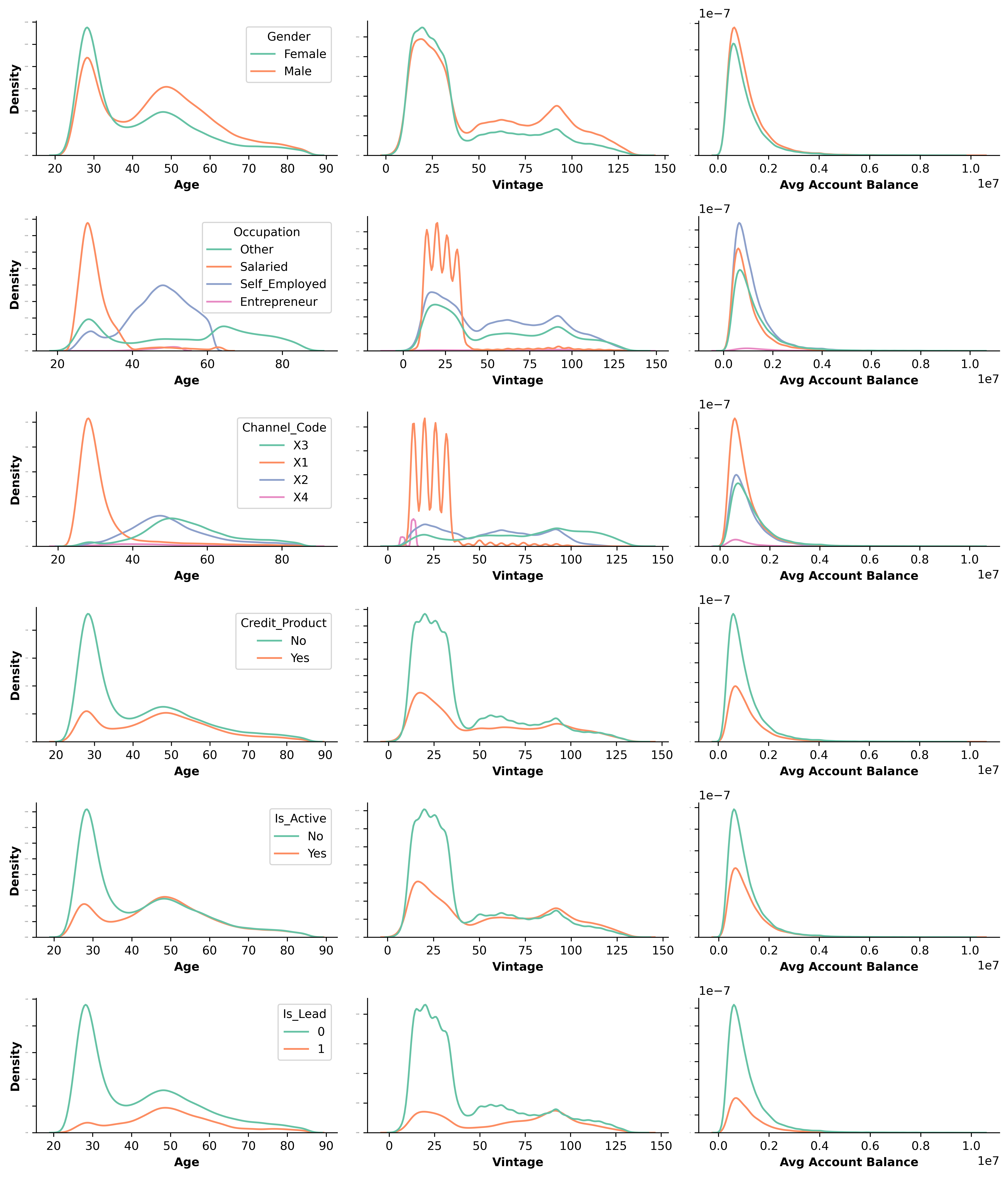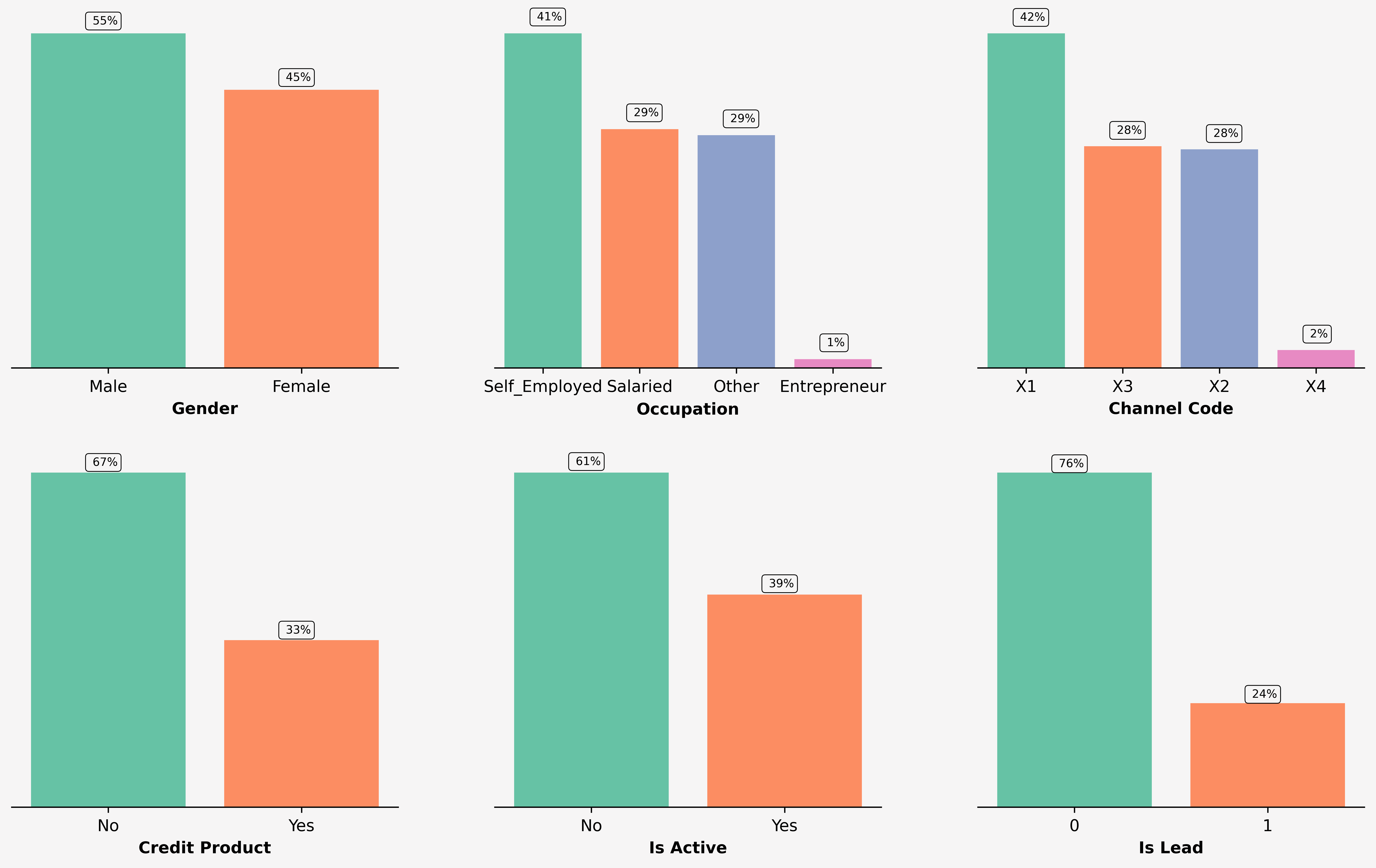 7-Categorical Columns: ['Gender', 'Region_Code', 'Occupation', 'Channel_Code', 'Credit_Product', 'Is_Active', 'Is_Lead'],